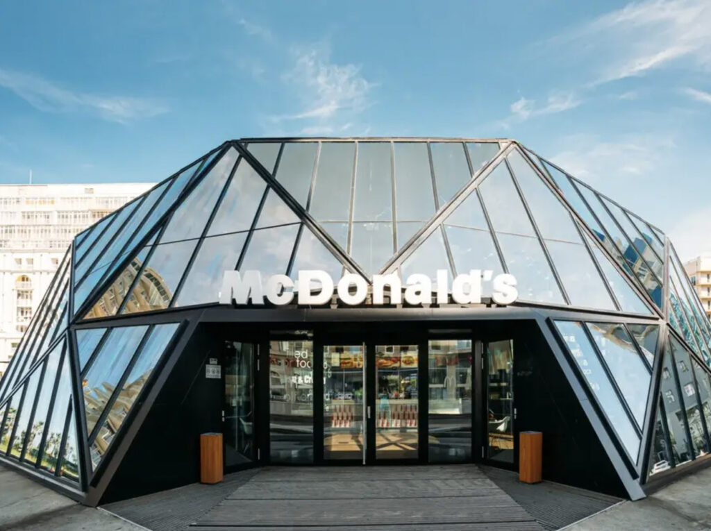 Geometric-shaped windows replace the yellow arches of this modern, glass-domed McDonald’s designed by Giorgi Khmaladze in 2013, creating one of the most unique-looking places to enjoy burgers and fries.