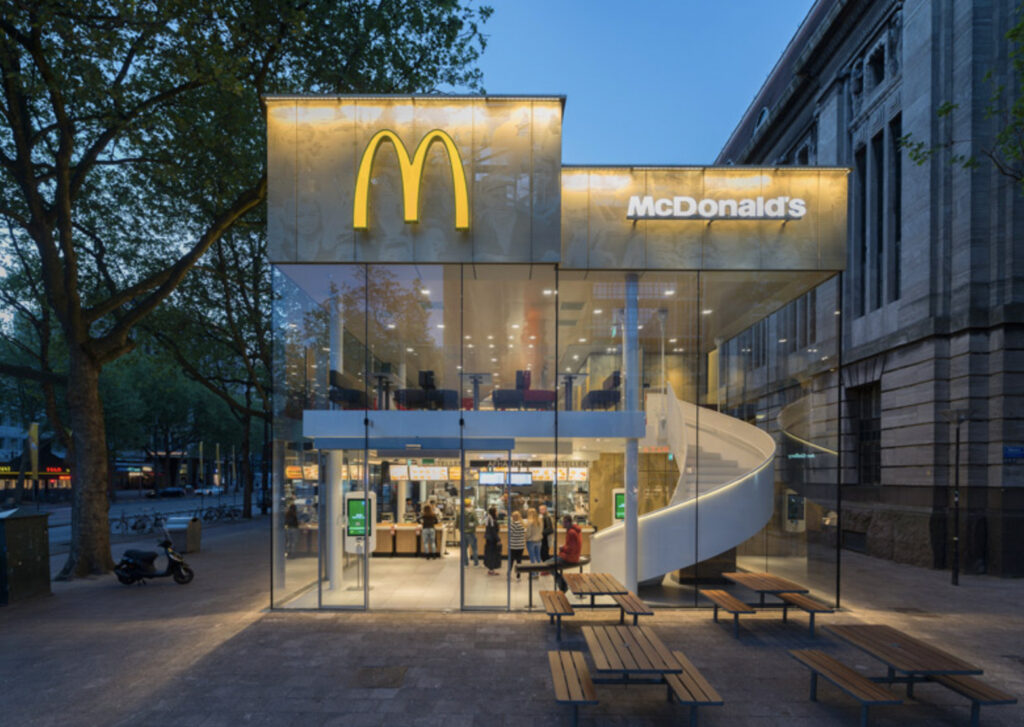 Designed by Mei Architects, this McDonald’s offers unrestricted views through the transparent double-story glass walls. From the outside of the building, you can admire the gold exterior and modern, indoor spiral staircase that leads to the second floor dining area.