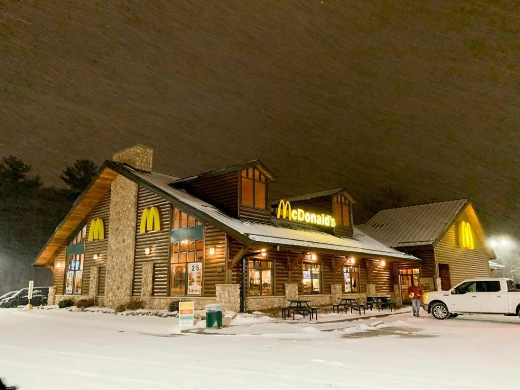 This isn’t your typical log cabin. The large, inviting McDonald’s restaurant in Wisconsin features a warm and cozy ambiance plus unique decor, such as a wood-carved bear and mounted moose head.