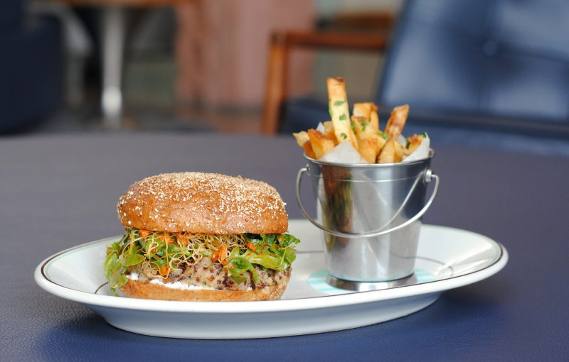 toasted farro, bulgur wheat, quinoa, sprouts, pine nuts, wild arugula, creamy goat cheese and red pepper vinaigrette, served on a toasted cracked wheat bun - Hangover Burger | $16