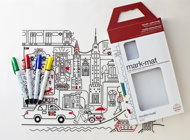 Kidz Placemats Put away the cell phone games. Let the little ones express creative freedom with these cool color-on food-grade silicone placemats. $18 individually; $27 as a Kidz Box (one placemat and set of six markers). www.modern-twist.com.