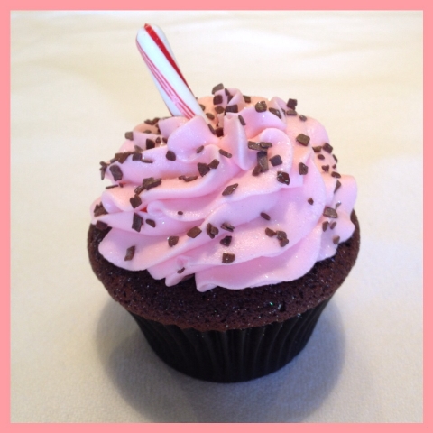 4. Now it’s time to decorate and add the final touches to your cupcake. We tint our buttercream icing a light pink using Americolor food coloring to signify the peppermint flavor. We also use a large star tip (4CS) to create the pretty ruffle design. Next, sprinkle your icing with chocolate shavings or sprinkles; you can also drizzle your extra fudge over the top for added chocolate flavor. Add a peppermint stick for fun, just like you would with a warm cup of hot cocoa and enjoy.