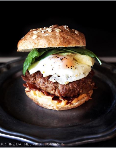 Heat a cast iron pan or grill pan to medium-high heat. Combine the chorizo and Angus and form into four balls and flatten with your palm.  Add a drizzle of olive oil to the preheated pan and place the burgers on. With a spatula press each burger down further to form thin patties. Let them caramelize for three to four minutes without moving to form a good crust. Flip the burger and cook for another two to three minutes. Reduce the heat to medium low. Meanwhile, spread some aioli on both sides of each toasted bun.  Place the cooked cheeseburgers on the toasted buns. Top each burger with bacon, avocado, spinach and a fried egg.