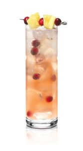 Muddle cranberries and pineapple in a cocktail shaker. Add ice and rest of ingredients except soda and shake vigorously. Pour into a Collins glass with fresh ice and top with soda. Garnish with chunk of pineapple and/or three cranberries on a toothpick laid horizontally over rim of the glass.