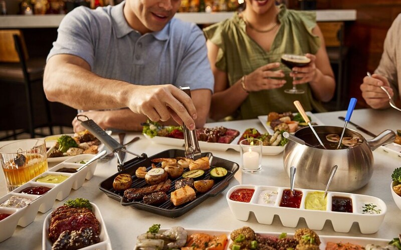 It begins with rich, award-winning cheese fondue paired with fresh breads and vegetables, followed by crisp salads that offer a refreshing balance. The entrée course brings a variety of premium proteins to the table, cooked right at your place setting, before ending on a sweet note with chocolate fondue, perfect for sharing.