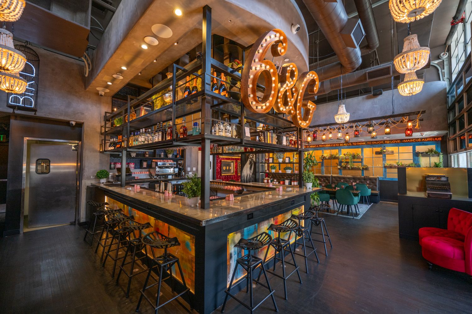 Step into a festival atmosphere with dazzling drinks at this electrifying new brunch spot. 6th and G flips the script on your typical morning meal with waffle pops (in s’mores, blueberry, and maple bacon flavors), matcha flood pancakes, Turkish eggs, and the show-stopping shrimp katsu benedict. Enjoy cocktails wrapped in smoke bubbles, raining cotton candy garnishes, and over-the-top Bloody Marys that are practically a full feast.