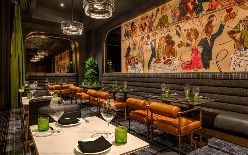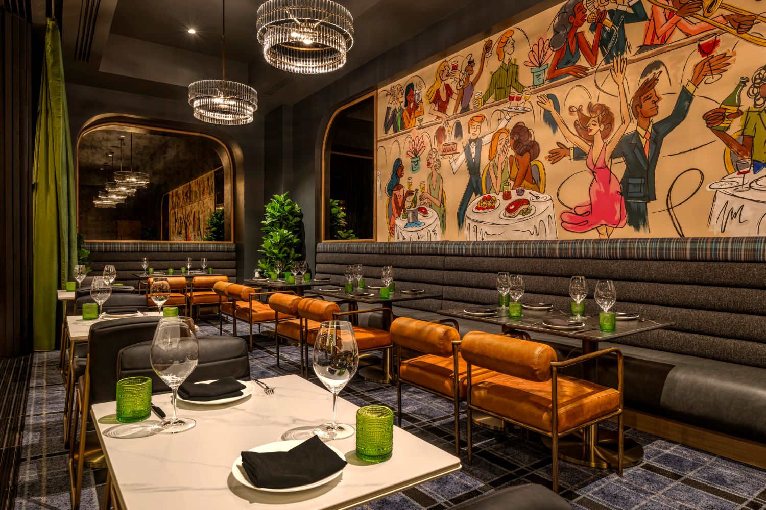 Following an extensive redesign led by House of Form and LGE Design Build, The Americano now offers a warmer, livelier atmosphere that blends Italian elegance with modern luxury. The reimagined space centers around two lushly framed banquettes surrounded by greenery, jewel-toned accents, and elegant brass and marble detailing. Tailored plaid and houndstooth upholstery bring a touch of classic charm, while a hand-painted mural by artist Timothy Brennan of Great, Not Good Co. serves as a striking focal point.