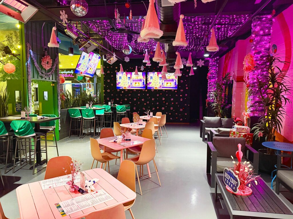 The eatery has transformed its Flamingo Room patio into the Frosty Flamingo, a Palm Springs-inspired Christmas pop-up filled with floor-to-ceiling décor, more than 3,000 lights, and whimsical photo ops + festive cocktails.