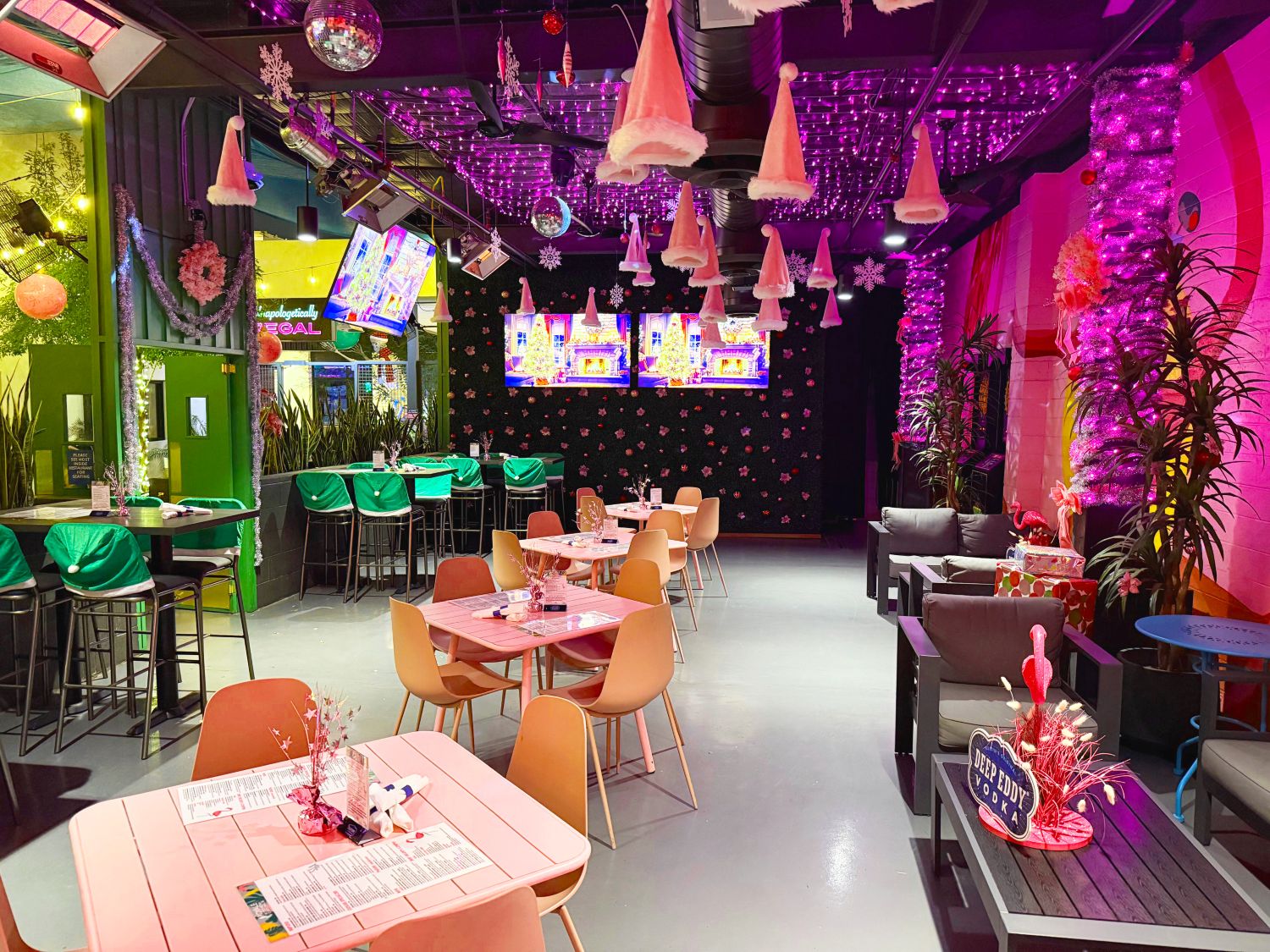 The eatery has transformed its Flamingo Room patio into the Frosty Flamingo, a Palm Springs-inspired Christmas pop-up filled with floor-to-ceiling décor, more than 3,000 lights, and whimsical photo ops + festive cocktails.