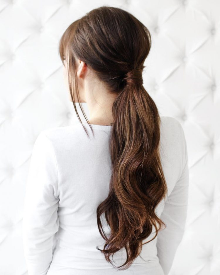 How to achieve this look: This look is simple and easy to achieve. After washing and drying your luscious locks, take a flat iron to smooth out any frizz. Once in a ponytail, take a small strand of hair from the back of the ponytail and wrap it around the ponytail base to hide the band. Tuck the strand back into the band to hold it into place. Add a mousse or hair spray to get a sleeker look.